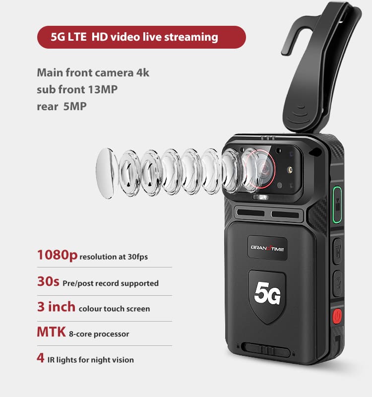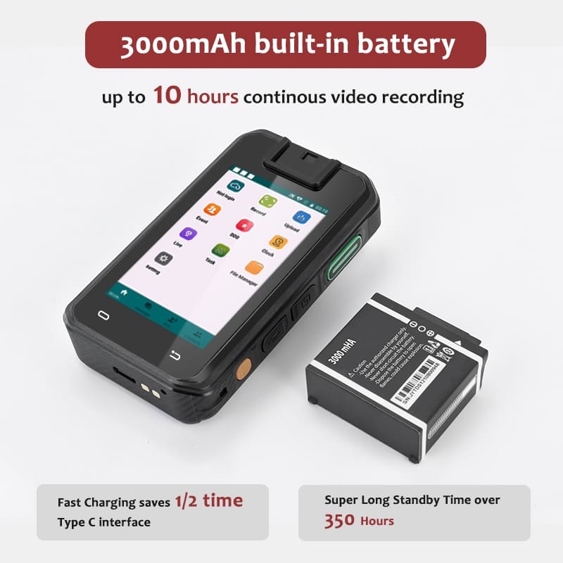 5G body worn camera S1 adopts the Android 10.0 platform, can realize 4K HD video recording, AI intelligent recognition, meets low power consumption, long working-time endurance, adopts a 3.0-inch touch screen, supports main and auxiliary dual cameras, built-in acceleration sensor, and NFC. It can meet the expansion of daily business. Through the perfect integration of 5G/4G/3G wireless transmission and intelligent machine vision, we will redefine the industry solution of wireless Body Worn Camera by combining intelligent perception, HD video transmission, command, and scheduling functions.